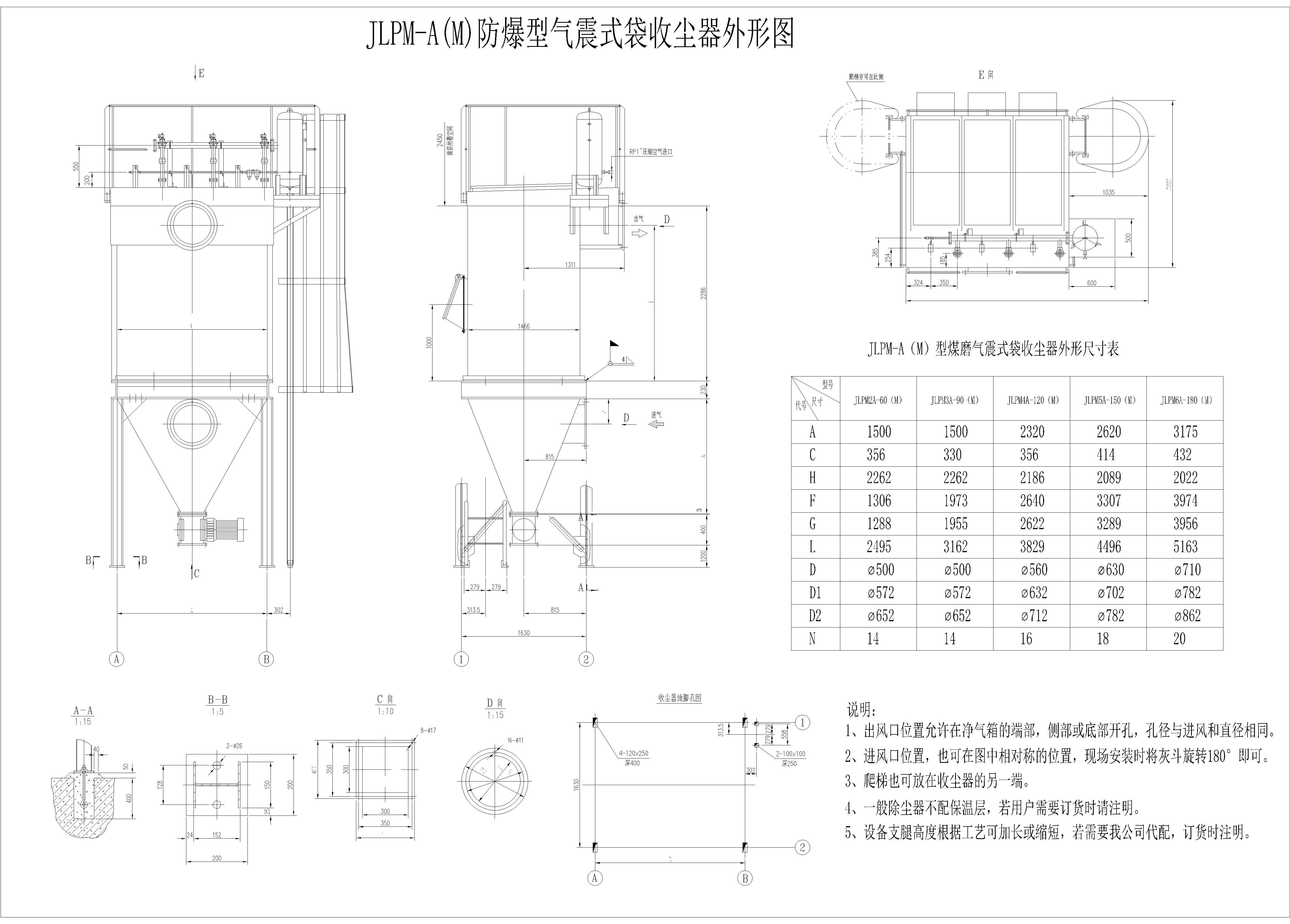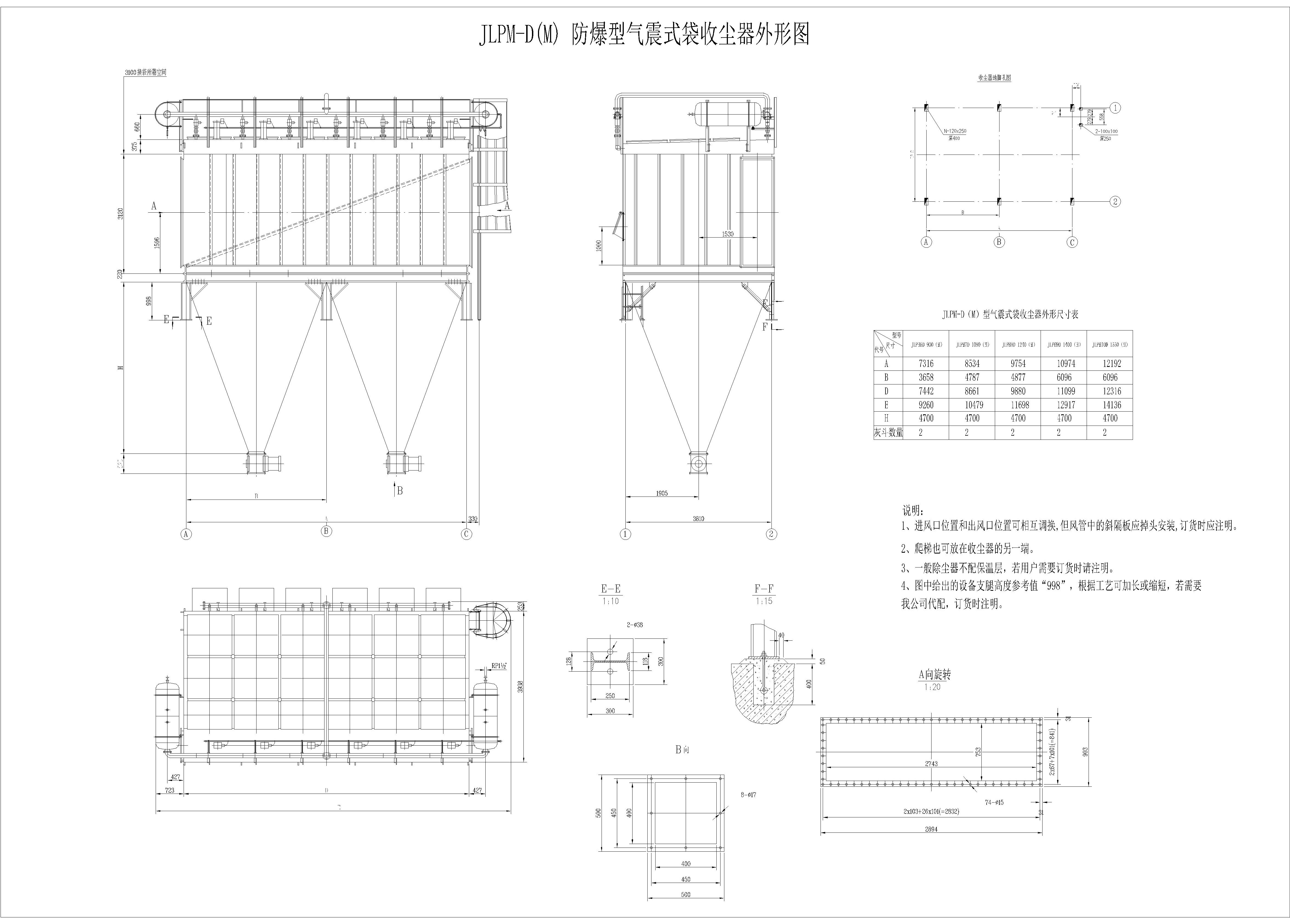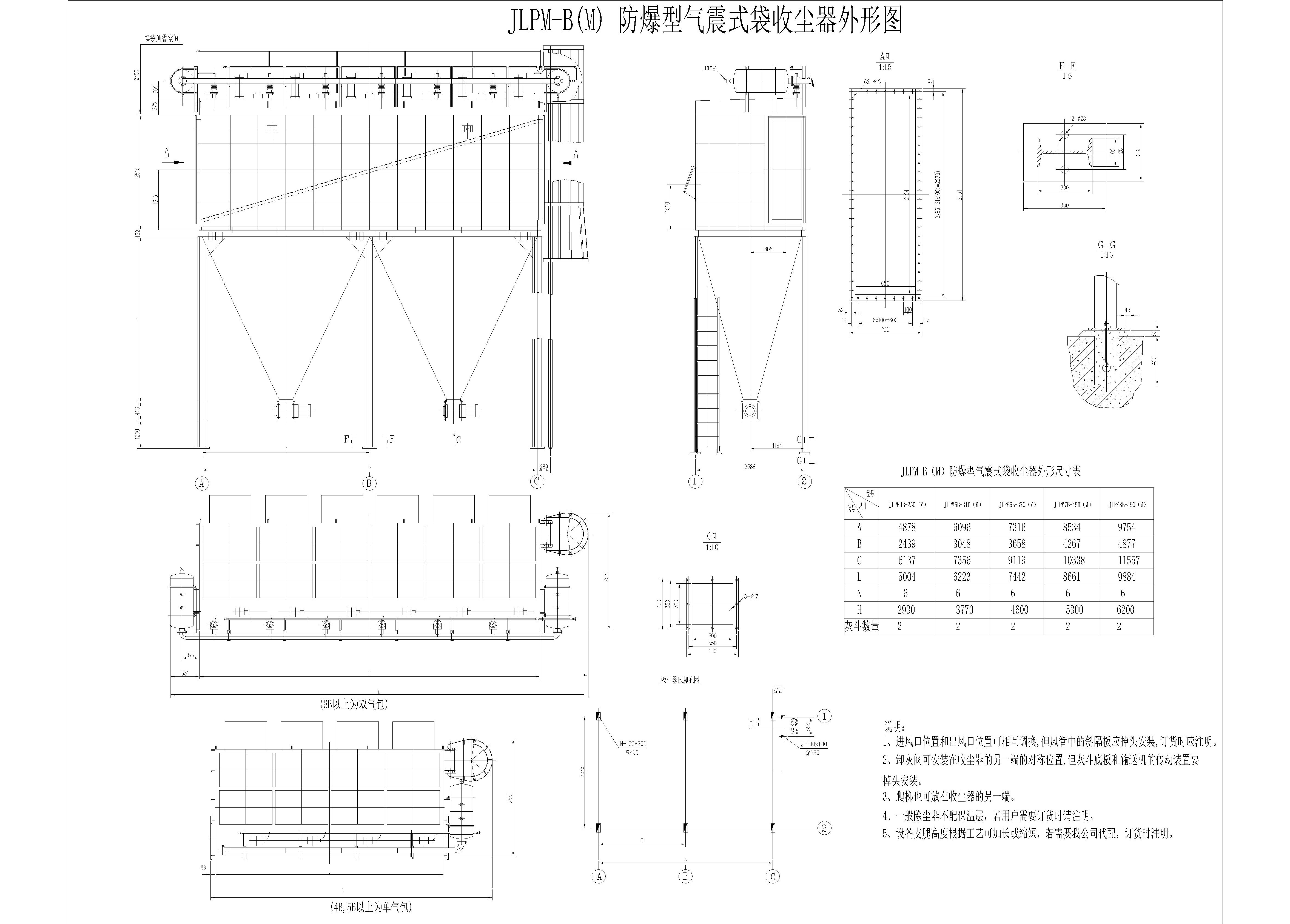 舉例:JLPM(M)7B-450表示為B系列單排7個(gè)室,總過濾面積為434㎡的JLPM(M)煤磨型氣震式袋收塵器。JLPM(M)2x5C-920表示為C系列的雙排5室,總過濾面積為929㎡的JLPM(M)煤磨型氣震林袋收塵器。